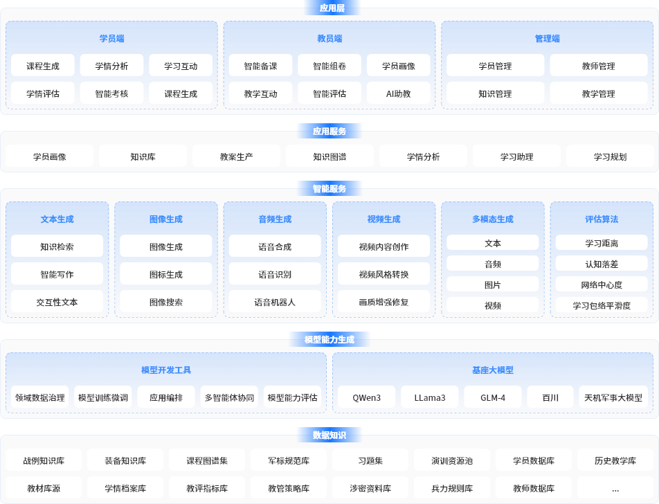 同时覆盖教员(智能备课)、学员(路径规划)、教管(资源调度)三大角色需求,系统以“智能体集群”实现跨角色协同,提升院校整体教学效能
