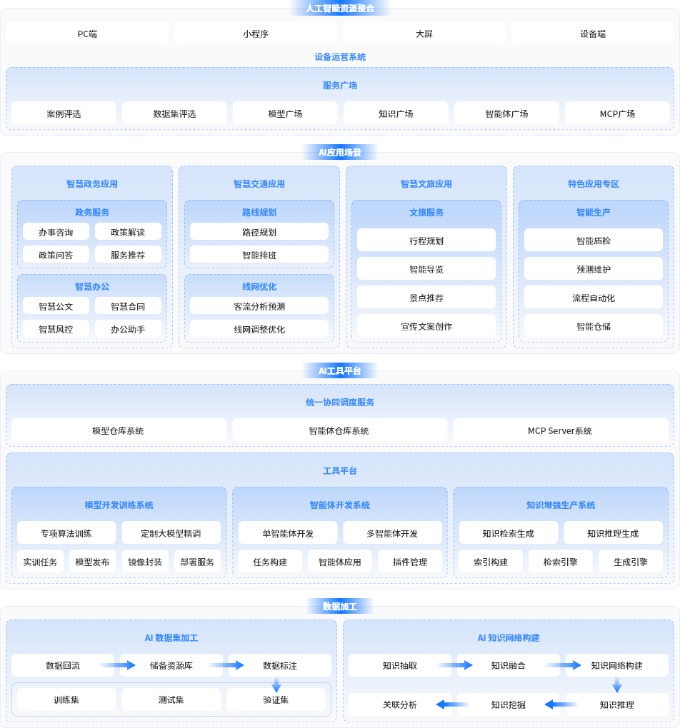 深度融合大模型与生成式AI技术,构建“数据-模型-智能体-应用”全流程智能中枢,打破传统城市治理中数据割裂、技术分散的壁垒,为城市智能化提供底层技术支撑
