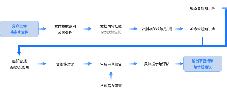 消保部门需应用各业务部门大量的待审查文件,且审查需依据海量政策反馈以及业务规范文件,同时审查过程目前主要是以人工的方式,且存在反复修改的问题。